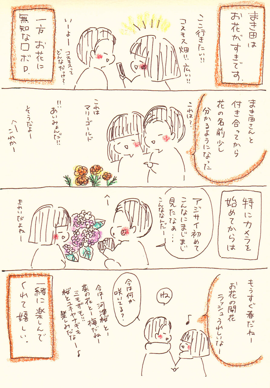 2020年03月08日 カテゴリ : 日常ロボD 少しずつお似合いになればいいね 去年私がロボDと付き合って変わったことを書いたので、今回はロボDが変わったな~と思うこと。私も詳しいわけではないけど、ロボDは本当にお花知らなくて(かろうじて桜とチューリップとひまわりくらい)、最初びっくりした。笑でも男の子だしそんなものなのかも?一緒に楽しめるようになってよかった。笑カメラに感謝。笑ブログを書いてると、私とロボDをお似合い!と言ってくださる方が多いのですが…私たちは元々価値観や感性が同じだったかというと、そうじゃないことの方が多かったと思います。音楽の趣味とか、すきな映画とか。ロボD絵全く描かないし、休日の過ごし方とか友達付き合いの仕方とか。違うことがたくさんあったけど、少しずつ共感やすり合わせをしてきました。日常生活のふとしたときに、似てきたな~と思うことがたくさんあります。今では同じタイミングで同じことを言うこともしばしば。笑これからも少しずつ、もっとお似合いになっていきたいね。おまけ入居したときから天井にうっすらいる小さなエネゴリくん。毎晩お風呂入るたびにエネゴリくん…って思いながら見上げてるんだけどな。いつかエネゴリくんもわかってもらえる日が来るだろうか…おわり*****前回の記事にもコメントたくさんありがとうございました!何件かにお返事させていただきます。・陽香さんありがとうございます~!筆ペンで頑張ってそれっぽく書きました(*^O^*)けものフレンズ、観たことはないのですがなんとなく知ってます!いつか観たいな~動物…犬も猫もインコもハムスターも同じくらい全部すきです…!たくさん…!動物園でシロクマのお尻にやられました…!もふもふで本当に可愛かったです…!・かほさんお祝いのお言葉ありがとうございます~!かほさんも行ったことあるのですね~◎私は初めてだったのですが、ロボDは小さい頃に家族で行ったことがあったみたいです!大人になるとまた違った楽しさがあって楽しいです(*^^*)・misakiさんすごく褒めてくださりありがとうございます!笑私はネット検索もよくするのですが、オレンジページとレタスクラブのベスト本を購入したので、それを見て作ることも多いです~◎レシピ本は三冊持っているのですが、買うときに重視しているのはとにかくレシピが多く収録されている(工程の写真や説明が少なく、長くても1ページ内でレシピが完結している)メインの料理以外の、副菜や一品レシピが多く収録されていることです!私は副菜どうしよう~となるとこが多いので…!・みさハムさんお誕生日おめでとうございました!体調大丈夫ですか?(;;)コロナ本当に大変ですよね…!早く終息して、またいつも通りの生活になるといいなあと思っています(;;)体調に気を付けて、20歳楽しんでください◎・Erikaさんおうち居酒屋おすすめですよ~!私たちはどちらかというと少食なのですが種類は色々食べたい!となっちゃうので、おうちならすきな量で食べられるのが嬉しいです笑レシピ本が出せるほどの腕ではないですが…笑いつかエッセイ本みたいなのを出せたら楽しそうですね◎ロボDにおめでとうをありがとうございました!おうち居酒屋すごく褒めてもらえて嬉しい限りです(;∀;)おうち居酒屋自体はよくやるのですが、今回初めてメニュー表作ったらロボDの喜び様がすごかったので一手間かかるけどおすすめ◎笑*****まき田 タグ :#まき田#ロボD#変わったこと#これからもよろしくね